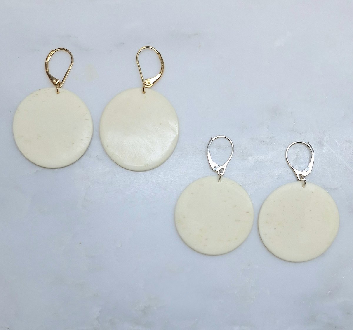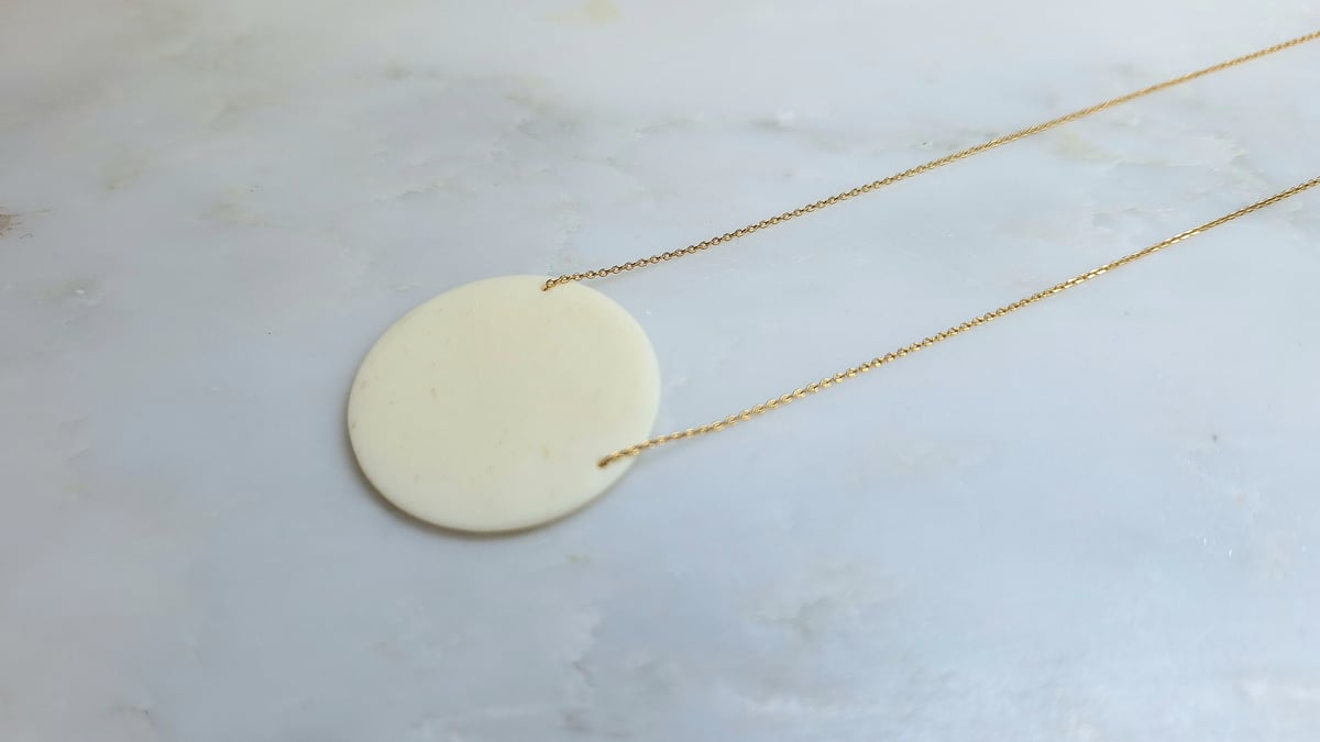 Des créations inspirées par la ligne Terre/Ciel, la temporalité, l'énergie féminine lunaire. Pastilles de 3 cm de diamètre, blanc cassé, légèrement polies, à l'aspect mat et doux. Ces "pleines lunes" sont des jetons de jeu anciens (XIXè) en os naturel.